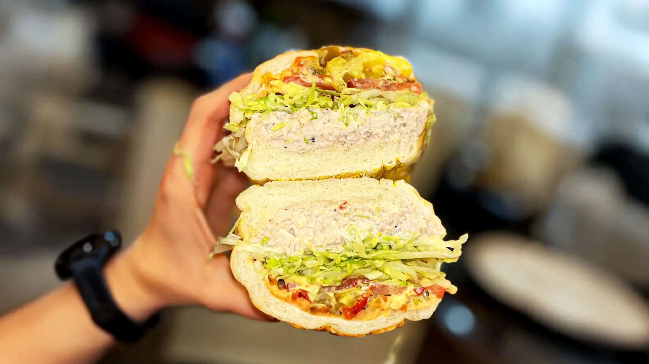 ✅ Tuna salad (mayo, celery, onion, pepper—no extra salt because the pickled add-ons handle it)